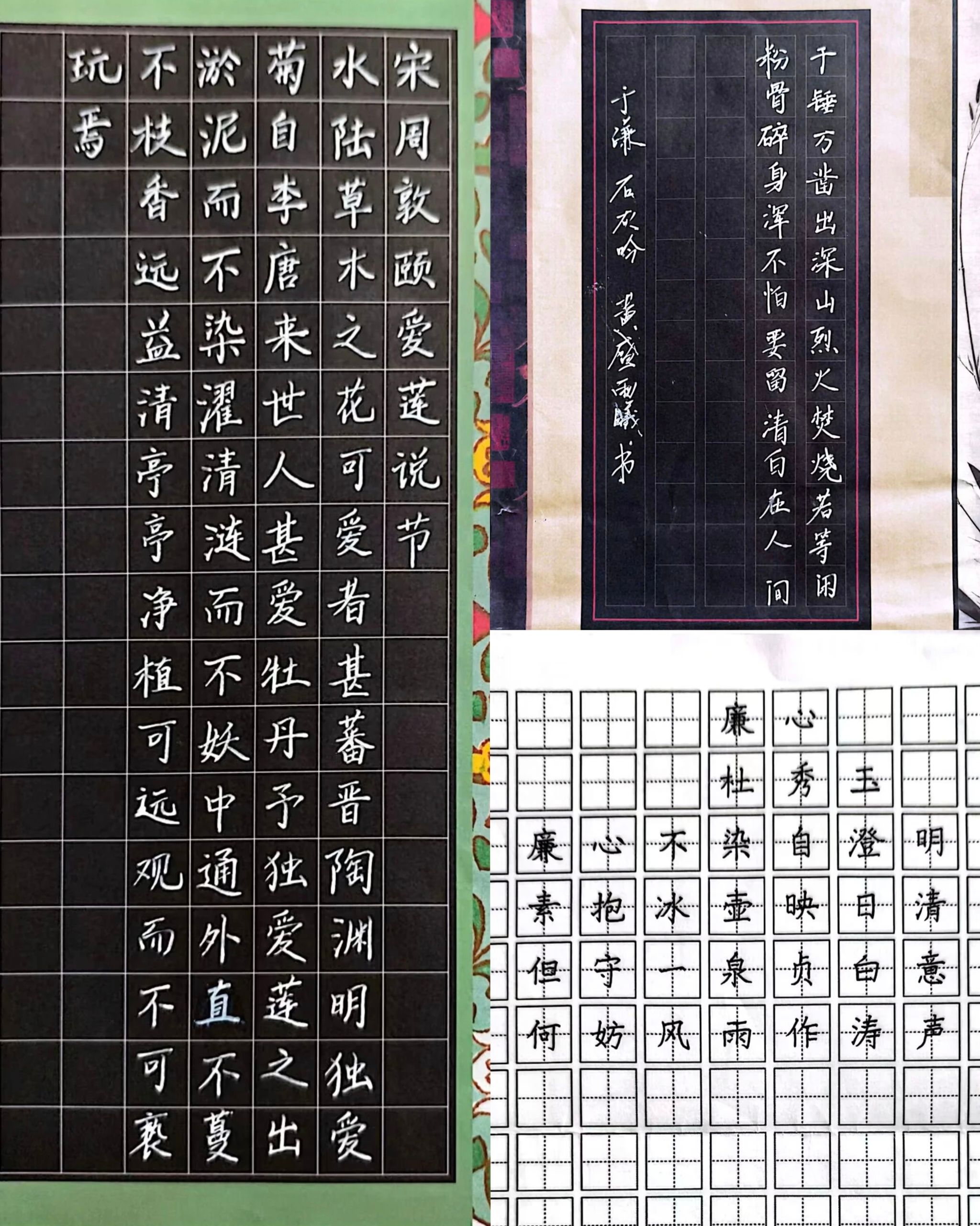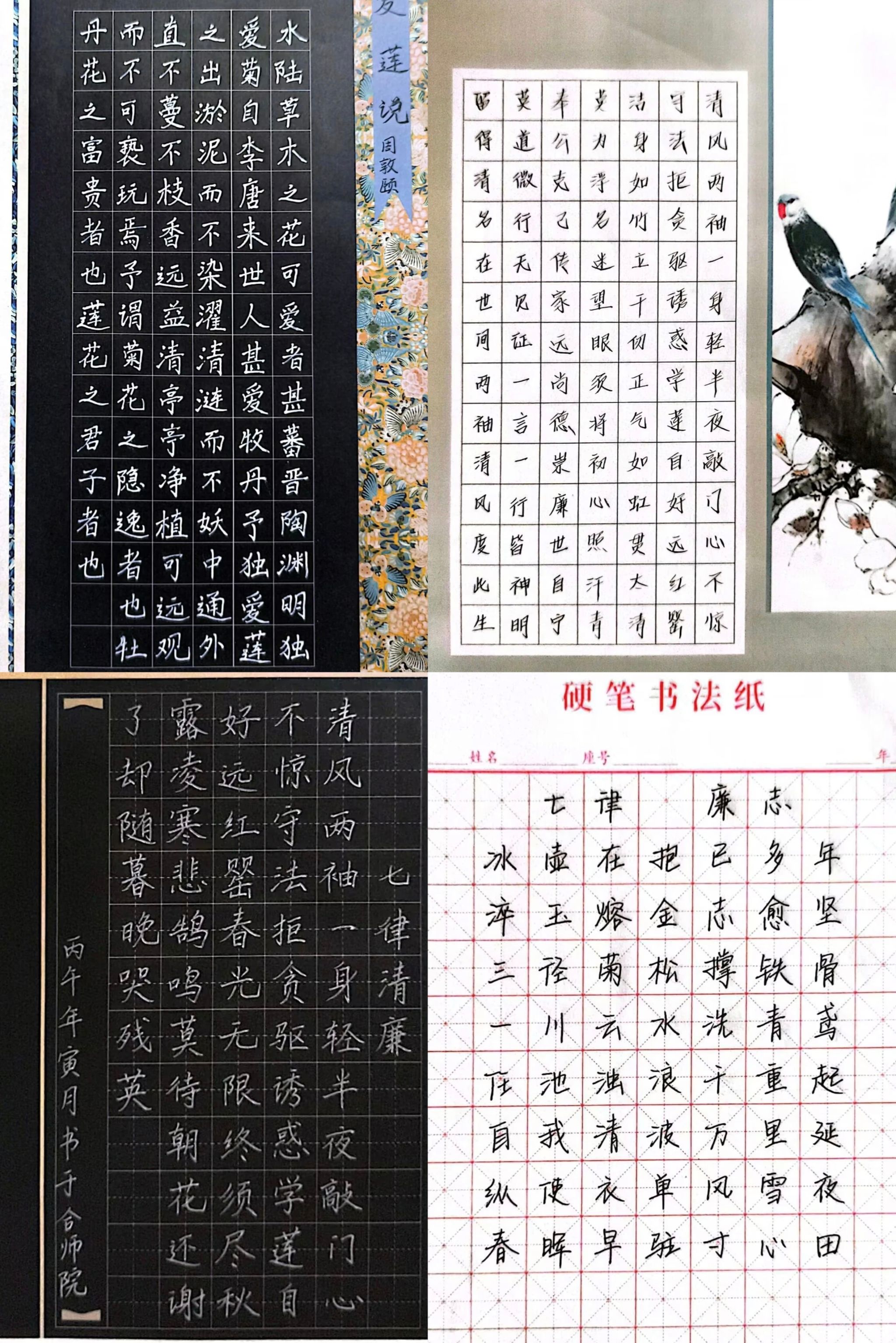 25级化学(师范)2班陈敏楠、25级化学(师范)2班王诗棋、25级化学(师范)2班刘钰、25级药物制剂(专升本)1班孙若文的作品,从《爱莲说》的清雅守正,到廉洁诗的正气凛然;从黑底白字的端庄凝练,到米字格间的灵动舒展,书写者以笔为犁,以墨为种,在尺素之上耕耘出一片廉洁天地。笔走龙蛇间,清风自来;字里行间里,初心不改。这四幅作品,是书写者对传统文化的深情致敬,更是对廉洁精神的有力践行,为校园廉洁文化建设注入了鲜活的笔墨力量,尽显新时代青年学子的笔墨担当与精神风貌。