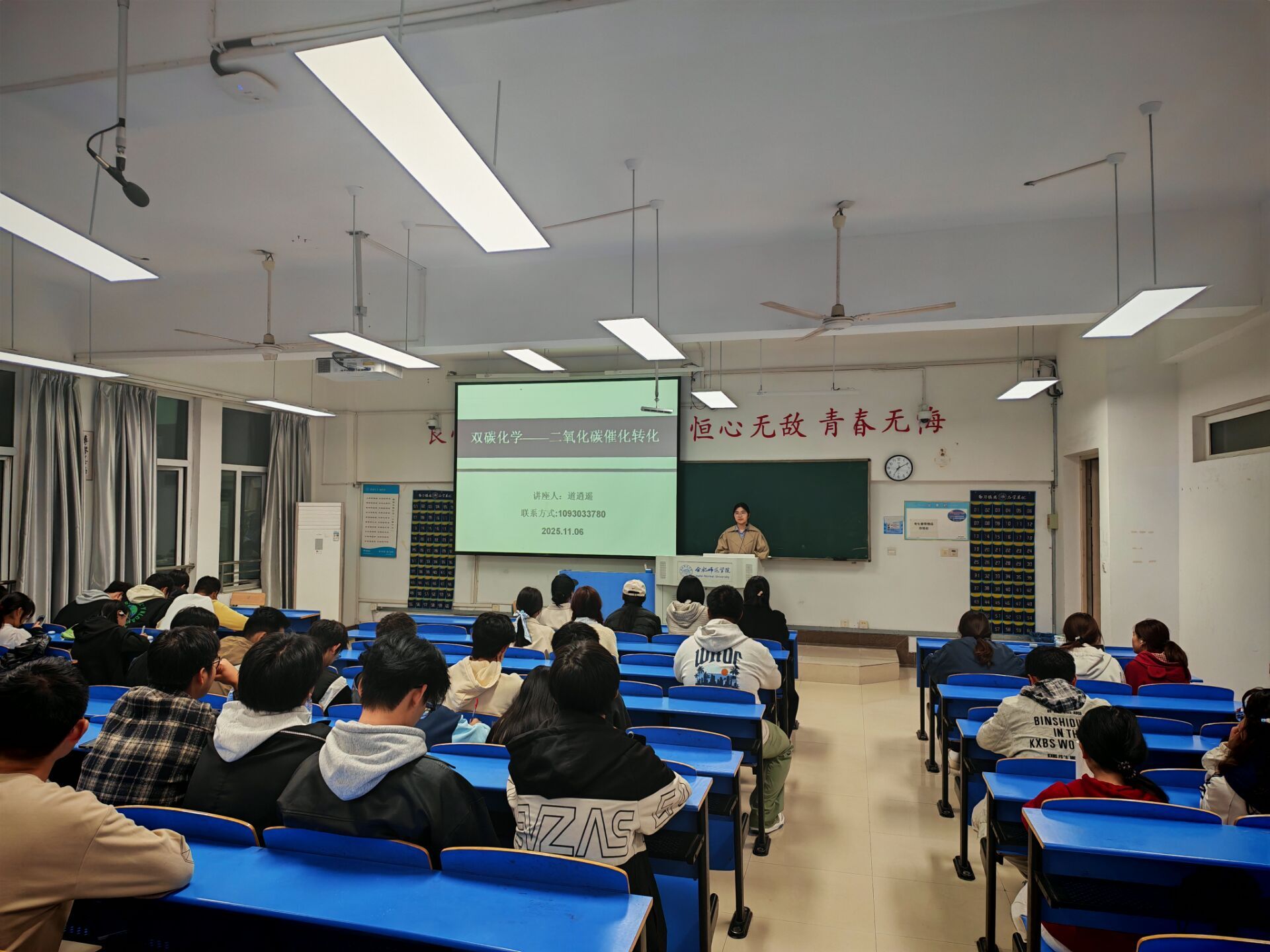 本网讯 11月6日下午,tyc7111cc太阳成集团教师道逍遥博士在锦绣校区逸夫楼A306举行了一场题为“双碳化学——二氧化碳催化转化”的学术报告。化学等相关专业学生聆听了报告。
